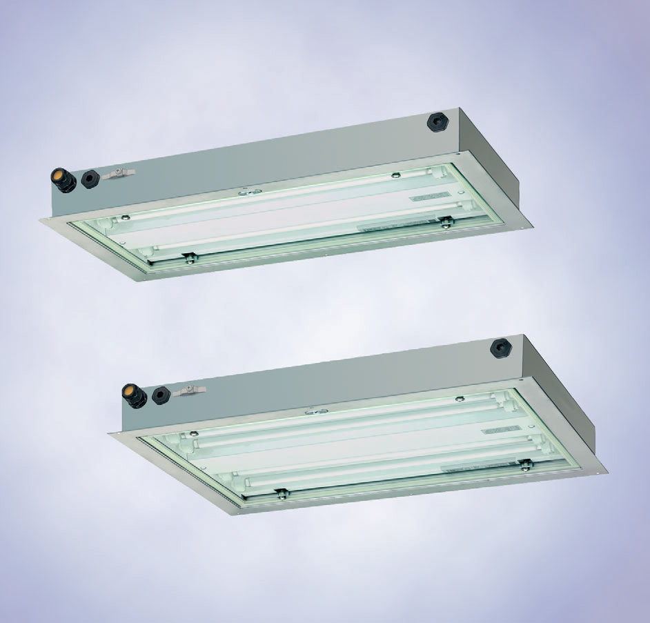 Светильники серии 6012 и 6412 с монтажной высотой всего лишь 80 мм идеально подходят для применения в виде потолочных светильников особенно в литьевых и лакировочных цехах, а также в чистых производственных помещениях.